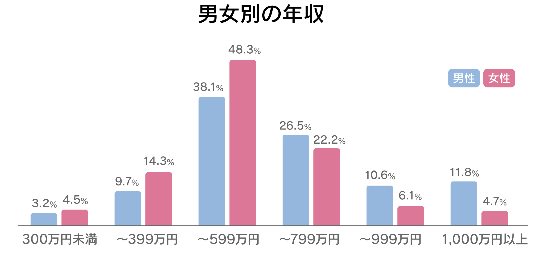 男女ともに、年収は400〜599万円がボリュームゾーンです。